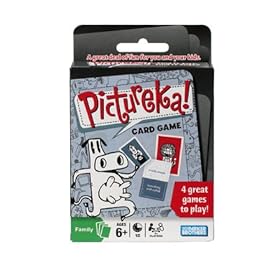 Pictureka!: This card game has a bit more flexible audience, since this one is for a younger age (6 and up) and allows for more players (2-?). There are four mini-games you can play using this deck of cards, all of them rather corny. There are two piles - mission cards and picture cards. Mission cards have descriptions on them (i.e. a wild animal), and picture cards have [very strange] pictures on them. The games you can play vary from finding objects on your picture cards beggining with the letters A-Z, a memory game where you must match the picture cards to a mission card, a version of poker where three picture cards in your hand must match one mission, and a racing game to be the first to find cards you have that correspond with a mission card. Whenever any of these things happen you must yell "pictureka!" (rhymes with eureka).